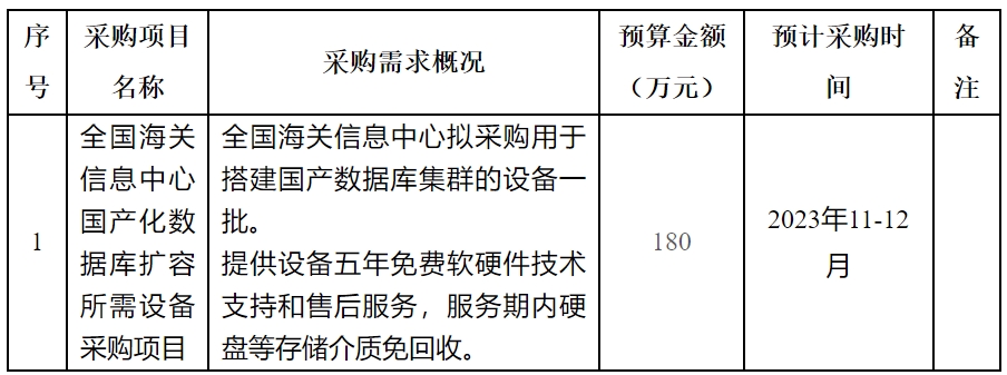 为便于供应商及时了解政府采购信息,根据《财政部关于开展政府采购意向公开工作的通知》(财库〔2020〕10号)等有关规定,现将(海关总署) 2023 年11(至)12月采购意向公开如下: