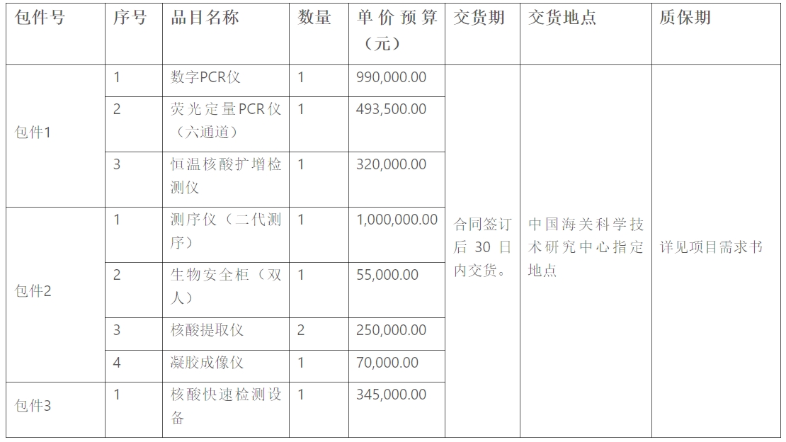 海关总署物资装备采购中心就“中国海关科学技术研究中心2023年数字PCR仪等设备采购项目”进行国内公开招标采购,现邀请符合资格条件的投标人前来投标。本项目招标活动将严格落实节约能源、保护环境、扶持不发达地区和少数民族地区、促进中小企业发展、落实平等对待内外资企业等政府采购政策。